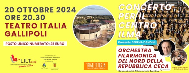 Musica classica & Solidarietà: a Gallipoli il “Concerto per il Centro Ilma” Appuntamento domenica 20 ottobre, alle ore 20.30, nel Teatro Italia per un grande evento di raccolta fondi che vedrà protagonisti i 50 maestri dell’Orchestra Filarmonica del Nord della Repubblica Ceca diretti dal M° Alfonso Scarano e la violinista Giulia RimondaOspite d’eccezione Serena Dandini, conduttrice della serataLa Lega contro i tumori di Lecce è lieta di invitarvi alla prima edizione del “Concerto per il Centro Ilma”, una grande serata di musica e solidarietà in programma domenica 20 ottobre, alle ore 20.30, nel Teatro Italia di Gallipoli. Un evento benefico organizzato grazie al sostegno di diverse realtà imprenditoriali del territorio, la collaborazione dell’Associazione Amici della Lirica “Tito Schipa” di Lecce e il patrocinio del Comune di Gallipoli e della Provincia di Lecce, il cui ricavato andrà interamente al Centro Ilma, l’Istituto multidisciplinare per la lotta ai tumori che Lilt Lecce ha realizzato alle porte di Gallipoli.Protagonisti della serata saranno i 50 maestri dell’Orchestra Filarmonica del Nord della Repubblica Ceca diretti dal M° Alfonso Scarano e la violinista Giulia Rimonda, con un programma che spazia da Beethoven (Egmont Ouverture) a Bruch (Concerto per violino e orchestra n.1 op. 26) e Mendelsshon (Sinfonia nr. 3 Scozzese).Ospite d’eccezione Serena Dandini, conduttrice della serata, in passato già al fianco della Lilt di Lecce in occasione di un altro importante concerto-evento (“No More”) di protesta contro i progetti di ben 16 impianti a biomasse previsti nel territorio salentino, per fortuna poi mai realizzati.I biglietti del Concerto hanno un costo di 25 euro e sono disponibili presso: Botteghino del Teatro (Tel. 333 2343114) La Biglietteria (Tel. 0833 19 300 30) Sedi LILT (Tel. 0833 51 27 77 info@legatumorilecce.org)Online su https://labiglietteriagallipoli.it/biglietti/concerto-ilma-gallipoli-20-ottobre-2024.htmL’intero ricavato della serata servirà a sostenere la dotazione tecnologica del Centro Ilma che, una volta completato, erogherà servizi gratuiti in favore della cittadinanza nei seguenti settori: Ricerca applicata sulle cause ambientali del cancro, Diagnosi precoce, Riabilitazione fisica e Sostegno psicologico, Assistenza socio-sanitaria domiciliare ai pazienti terminali, Divulgazione scientifica.Testimonial d’eccezione del “Centro Ilma”, lo ricordiamo, sono i Premi Oscar Helen Mirren e Taylor Hackford, i quali hanno realizzato due video-messaggi a sostegno dell’Istituto diffusi sui media e tramite i canali social e web Lilt Lecce (www.legatumorilecce.org).Il concerto si lega alla 17esima edizione del convegno Lilt Lecce sul tema “Ambiente e Salute” che quest’anno si terrà per la prima volta a Nardò, presso il Teatro comunale e il Chiostro dei Domenicani, nel giorno sabato 19 ottobre, a partire dalle ore 9.Nella mattinata di lunedì 21 ottobre, inoltre, la stessa Orchestra Filarmonica del Nord della Repubblica Ceca terrà un secondo concerto speciale con un programma dedicato esclusivamente alle scuole, sempre al Teatro Italia. Al pianoforte ci sarà il giovanissimo talento salentino Francesco Marra, di soli 11 anni, che eseguirà il Concerto n.1 per pianoforte e orchestra di Beethoven. Anche in questo caso il ricavato andrà interamente al Centro Ilma. Le scuole interessate possono contattare il numero 340 7383165 (Valeria, coordinatrice scuole).