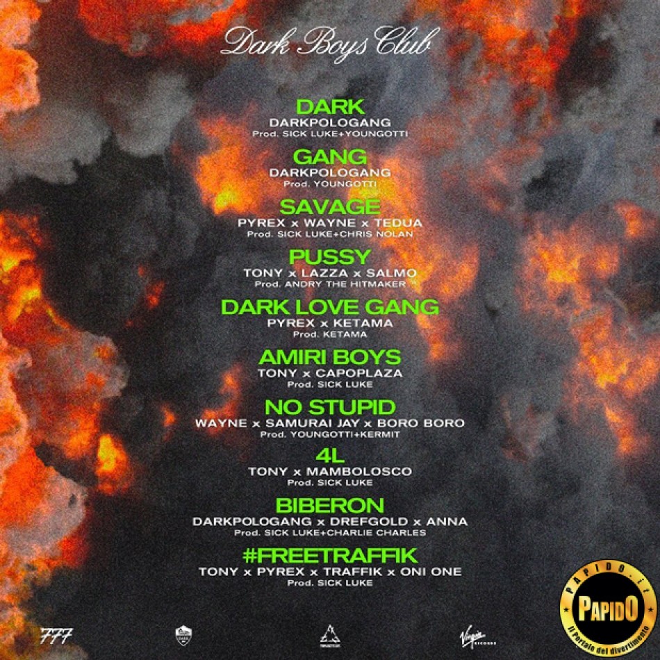 Dark Polo Club DARK POLO CLUB è il nuovo Mixtape in uscita della DARK POLO GANG Il nuovo lavoro discografico del collettivo trap romano composto da Nicolò Rapisarda in arte Tony Effe, Dylan Thomas Cerulli in arte Pyrex o Principe Pyrex e Umberto Violo in arte Wayne Santana, a circa un anno di distanza da Trap Lovers Reloaded, la riedizione di Trap Lovers, l'album certificato Disco di Platino dalla Fimi, dal quale sono state estratte hit come British e Cambiare Adesso Negli ultimi mesi, Tony Effe, Wayne Santana e Pyrex sono stati impegnati in collaborazioni con altri artisti e con singoli pubblicati da solisti, come nel caso di Bassotto di Tony Effe e Glock di Wayne Santana. Parlando di featuring, invece, recentemente, Pyrex ha collaborato con Ghali, per l'inedito Cacao, e con Giaime Dark Boys Club si preannuncia come una sorta di ritorno alle origini per la Dark Polo Gang Per questo nuovo mixtape, la Dark Polo Gang ha collaborato con molti artisti della scena rap e trap italiana Gli artisti che appariranno nel mixtape sono: Tedua, Lazza, Salmo, Ketama, Capo Plaza, Samurai Jay, Boro Boro, Mambolosco, Drefgold, Anna, Traffik e Oni One by Paolo Papido