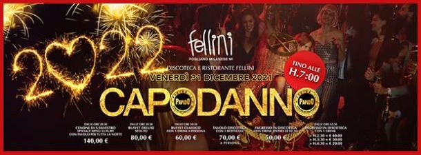 Capodanno Fellini Pogliano Milanese ✘ Venerdi 31 Dicembre 2021 🎉CAPODANNO @ FELLINI 🧨📍 Via Roma, 26 - Pogliano Milanese (Mi)🕕 dalle 20,30 alle 07,00 🕚----------------------------In occasione di CAPODANNO 2022 abbiamo il piacere di invitarvi all'Evento:CAPODANNO FELLINI POGLIANO MILANESE 💣La discoteca Fellini Pogliano Milanese, è ricavata da prestigiosa Villa Discoteca Fellini Pogliano Milanese, è ricavata da prestigiosa Villa in stile Moresco immersa nel verde è il palcoscenico ideale della notte da vivere immergendosi nei suoni e nei suggestivi scenari che caratterizzano questa location esclusiva. Le piscine illuminate, gli eleganti marmi, i preziosi tappeti, i cuscini orientali, i giochi di luce, le scalinate nella roccia, rendono esclusivo ogni angolo e spazio di questo locale e la ricerca per lo stile si traduce in un'atmosfera unica, l'atmosfera Fellini 🥻» Suoni, Luci, Colori, Scenografie e tanto tanto Divertimento 👭Obbligo di mascherina e SUPER GREEN PASS per accedere 😷----------------------------↬ FORMULA DI INGRESSO solo con PAGAMENTO ANTICIPATO ✆ 3332434799☰ PREVENDITA CENONE SERVITO ☰(dalle 20,30 alle 07,00)140€ a Persona - MENUTavolo riservato nella zona ristorante fino a chiusuraDj Set fino alle 07,00☛ PREVENDITA OBBLIGATORIA ✆ 3332434799☰ PREVENDITA BUFFET SEDUTO ☰(dalle 20,30 alle 07,00)80€ a PersonaCena a Buffet (fino alle 23,00)Tavolo Riservato (fino alle 23,00)1 Drink + 1 FlûteDj Set fino alle 07,00☛ PREVENDITA OBBLIGATORIA ✆ 3332434799☰ PREVENDITA BUFFET ☰(dalle 20,30 alle 07,00)60€ a PersonaCena a Buffet (fino alle 23,00)1 DrinkDj Set fino alle 07,00☛ PREVENDITA OBBLIGATORIA ✆ 3332434799☰ PREVENDITA INGRESSO ☰(dalle 23,00 alle 02,30)50€ a Persona1 DrinkDj Set fino alle 07,00☛ PREVENDITA OBBLIGATORIA ✆ 3332434799☰ PREVENDITA TAVOLI ☰(dalle 23,00 alle 02,30)Tavolo 70€ a Persona(spesa minima 350€)Beverage a scelta da ListinoDj Set fino alle 07,00☛ PREVENDITA OBBLIGATORIA ✆ 3332434799----------------------------☰ PROGRAMMA DELLA SERATA ☰ore 20.30 - Cenone Servito - MENUore 20.30 - Royal Buffet Sedutoore 20.30 - Royal Buffetore 22.00 – Live Animationore 00.00 - Welcome 2022ore 00.01 - Party Felliniore 03.00 - Regalissimi per tuttiore 07.00 - Colazione con Cappuccio e Brioche☛ PREVENDITA OBBLIGATORIA ✆ 3332434799----------------------------Vietato l'ingresso ai Minorenni⚠️ La Direzione si riserva la selezione all'ingresso☛ PRENOTAZIONE OBBLIGATORIA☎ Info in Direct ✆ 3332434799