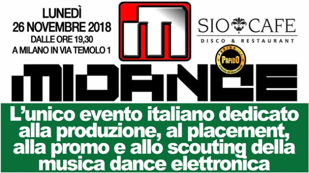 Midance 2018 Lunedì 26 novembre al Sio Cafe di Milano dj, produttori, musicisti, promoter, discografici italiani e non, si faranno sentire per l’unico evento italiano dedicato alla produzione, al placement, alla promo e allo scouting della musica dance elettronica Presso il Sio Cafe (Via Temolo, 1, 20126 Milano), lunedì 26 novembre 2018, dalle 19:30 si terrà la sedicesima edizione di Midance, la manifestazione “a scopo di placement” che permette a dj, produttori, musicisti, promoter e discografici di scambiare idee e trovare l'etichetta discografica o lo sfogo promozionale ideale Cosa accadrà al Midance 2018 punto per punto 1. Round Table. Dj e produttori incontreranno editori musicali e case discografiche. In costante rotazione, ognuno potrà suggerire le proprie idee ai professionisti presenti. Lo scopo? Ogni singolo rappresentante ha l’occasione di proporre il proprio business di persona. La caccia alla hit è aperta 2. Nuovi patrocini e nuove collaborazioni, per Midance, nell'edizione 2018. Il main partner Sio Cafe vede la conferma di media partner come Danceland Magazine, OMNE e l'arrivo di One Dance come radio in fm, Pressbeat come portale e Fabric Live come canale televisivo. SilverMusic Radio garantirà come consueto la sua diretta. Restano nel roster marchi come Wimpy Music, GIGC, Muzik Pusher, r12, Sindacato del Suono, PEEM; ci saranno anche i ragazzi dello studio BigBiz. Tra le case discografiche ed etichette che parteciperanno figurano le main label Energy Production, Do It Yourself, Bang Record, Tornado (FMA), Reshape (Dipiù Music), JE | Just Entertainment, IHU Music Group e Art & Music. Partecipano inoltre le outsider Hitaly Muzik, Royal Supreme e luv4luv 3. Live. Esibizione di artisti rappresentati da produttori, dj e marchi presenti. Ogni artista interpreterà un solo brano. Insomma, un mini festival. 4. Midance, Sio Cafe Influencer Chart 2018 e SIOscar. La classifica dei 100 personaggi più influenti della musica dance italiana nel mondo (manager, imprenditori, dj, musicisti, giornalisti, blogger, produttori, discografici e addetti ai lavori) sarà il fulcro della serata. Il countdown veloce porterà i presenti alla consegna degli encomi dei primi classificati. Targhe ricordo in memoria verranno riservate ai personaggi più meritevoli. Nasce poi SIOscar, il premio al giovane talento più promettente Cos'è Midance Midance si tiene ogni anno in inverno. Addetti ai lavori della musica dance elettronica si incontrano da 16 anni per dibattere svariate tematiche relative ai problemi dell’industria discografica e musicale. Midance è l'unico evento italiano dedicato alla produzione, al placement, alla promo e allo scouting. Artisti, produttori, giornalisti, speaker, dj e promoter del mondo delle sette note, indipendente e non, si incontrano dal 2002 nel massimo della serenità tra vinili, cd, chiavette e mp3, link e drink. Ogni professionista, a ogni incontro, ha l’occasione di scambiare e ascoltare demo e promozionali testandoli grazie alla consolle disponibile in loco. Il massimo per le proprie pubbliche relazioni. La partecipazione al Midance è gratuita. “Non è il Midem di Cannes e non è l'IMS di Ibiza né l’ADE di Amsterdam. Né altro. Midance è un meeting senza scopo di lucro nella città da bere, una città cara ma certamente con meno puzza al naso di tanti altri luoghi esotici. Unico fee: 10 euro di ingresso che dà diritto a una consumazione al buffet”, dice lo staff organizzatore composto da Riccardo Sada, la dj e partygoer Katya Malagnini, l’autore Pier Di Stolfo, il dj e produttore Roberto Turatti e il dj e speaker DJ Marietto. La supervisione della comunicazione è a cura di Guido Robustelli. Midance è l’unica manifestazione volta alla discografia clubbing, che resiste da anni in Italia e in grado di riunire il gotha della musica dance elettronica, clubbing underground, pop overground mainstream e non solo. Divertimento, business, nuove sonorità e mercato in una sola serata Scaletta serata di lunedì 26 novembre 2018 19,30 Midance warm-up 20,00 presentazione Midance 2018 20,02 discorso introduttivo main partner Sio Cafe 20,05 discorso introduttivo dei vari partner 20,30 inizio ufficiale Midance: royal buffet di benvenuto 21,00 incontri tra addetti ai lavori 21,30 selfie time e interviste nei corner: fotografie al red carpet 22,30 fine royal buffet di benvenuto 23,00 inizio esibizioni artisti 23.40 inizio countdown Midance & Sio Cafe Influencer Chart 2018 00,00 premiazioni varie Quando: Lunedì 26 novembre 2018 Orario Midance 2018: 19:30 Dove: Sio Cafe, Via Temolo 1, 20126 - Milano Official hashtag: #midance2018 #midanceitaly www.facebook.com/midanceitaly/ https://www.facebook.com/events/248878302484996/