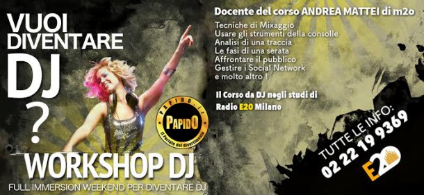 Workshop per Dj Arriva a Milano un Workshop per Dj Di corsi ce ne sono molti, questo si differenzia dagli altri per la durata, per le materie trattate e per “l’insegnante alla consolle” In totale sono 14 ore di lezione, divise in due giorni, sabato e domenica, due giorni nei quali chi parteciperà al Workshop migliorerà la tecnica di mixaggio, o la imparerà da zero, seguendo la linea guida di Andrea Mattei di M2o, autore di questo laboratorio di formazione dedicato a chi è pronto a sacrificare le proprie nottate a favore di una passione che può trasformarsi in una professione Fra gli argomenti trattati troviamo le tecniche di mixaggio, l’analisi di una serata nelle diverse fasi che la compongono, come approcciare al pubblico, e come porsi in maniera efficace in un incontro con un direttore artistico o con un responsabile di una serata. Un parte del laboratorio verrà dedicata all’uso dei social network per migliorare l’immagine professionale e aumentare il numero dei followersIl talento è un dono naturale ma avere successo è un lavoro impegnativo. Insomma da chi di una passione ne ha fatto una professione da oltre 15 anni, arriva un “giù il sipario” sul mondo della notte, competitivo, non semplice, ma se gestito nella giusta maniera, molto soddisfacente Sono aperte le iscrizioni al Workshop DJ che si terrà negli studi di una web radio milanese “Radio E20 Milano, in zona PiolaInfo 02 22199369 by Paolo Papido